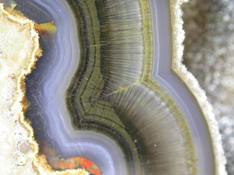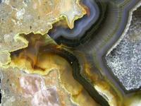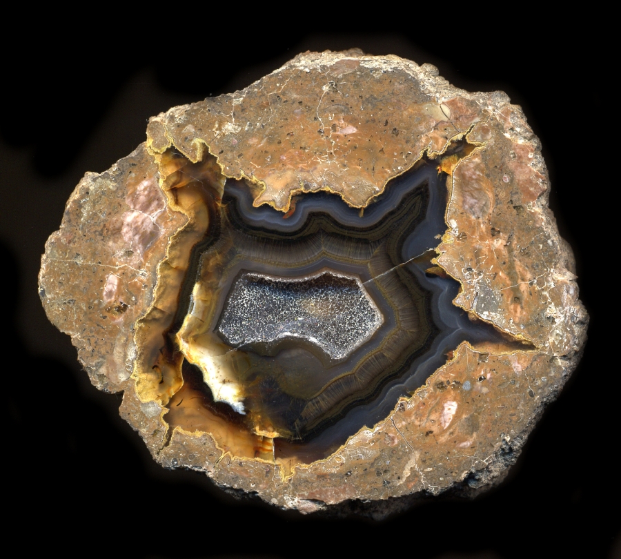 And unusually beautiful Friend Ranch thunderegg geode. here, the familiar clear gel-like agate is transformed to a beautiful layering of different textures surrounding a central hollow.