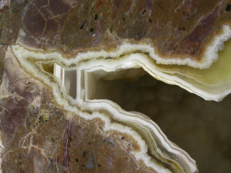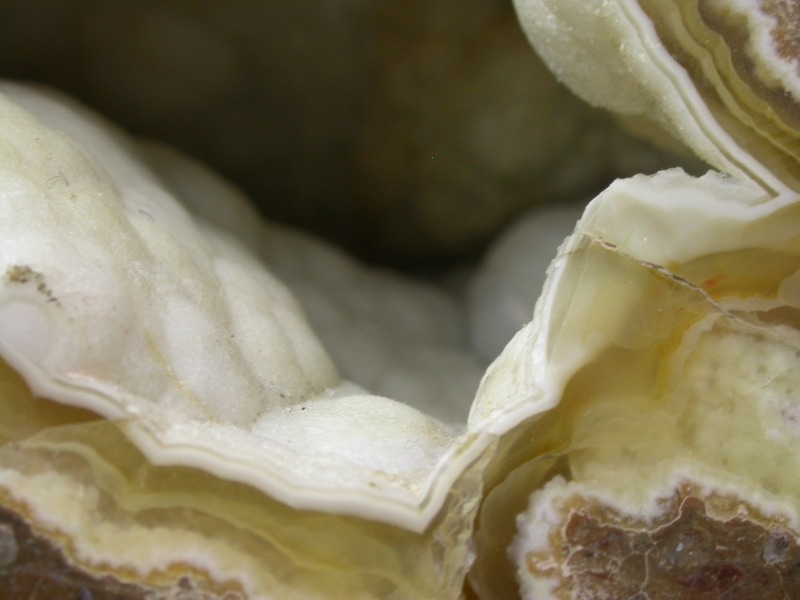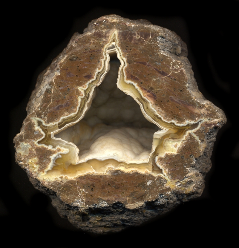 This is one of the first thundereggs I ever acquired. At the time I had no idea where it was from, but it is a remarkable stone, having a huge and dramatically shaped cavity lined with a thin layer of pillowy agate. Now, I am almost certain it is a Friend Ranch specimen - and that opinion is backed up by others. The matrix seems very characteristic. However, inside it is a very untypical Friend Ranch specimen - I have never seen another even close to this!