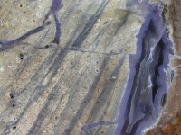 This is what a Dugway 'should' be. Savage and tense with that violet agate looking more like a lightning strike than a sweet border. That, more than in many Dugways, seems to bear out its thunderegg kinship as it possesses the sense of torn rock and frozen energy that is characteristic of a good thunderegg. This one is even more striking for its almost alarming grinning, toothy mouth and eyeless face. An absolute classic!